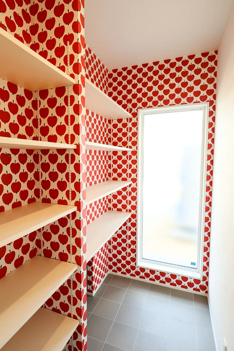 キッチン背面の大容量パントリーは、玄関から直接荷物を運び込める動線を確保。猫のフードや砂など、かさばりがちなペット用品もスムーズに収納できます。赤いリンゴ柄クロスの遊び心あるデザインも見どころです。