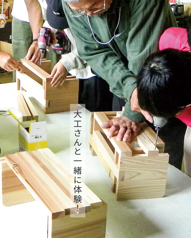 大工さんと一緒に楽しめるものづくり体験や、