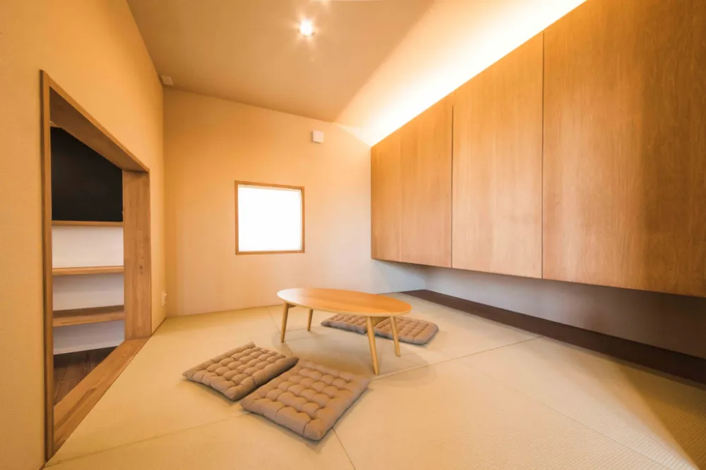 水廻りの近さ、配膳、家族とのコミュニケーションなどあらゆる便利さを生んだダイニングキッチン。モルタル塗りの大きなダイニングテーブルは一人ひとりがゆったり座れるスペースを確保し、さらには階段もベンチ代わりになるので大人数のゲストを招いて食事や会話を楽しむことができます。また、ダイニングテーブルに座った人との視線を合わせるためにキッチン側をあえて一段下げたこともポイントです。キッチン横に配置した和室は、外の景色を眺めることもでき、洗濯物を畳んだり、子供が遊んだりとフレキシブルに使用できます。