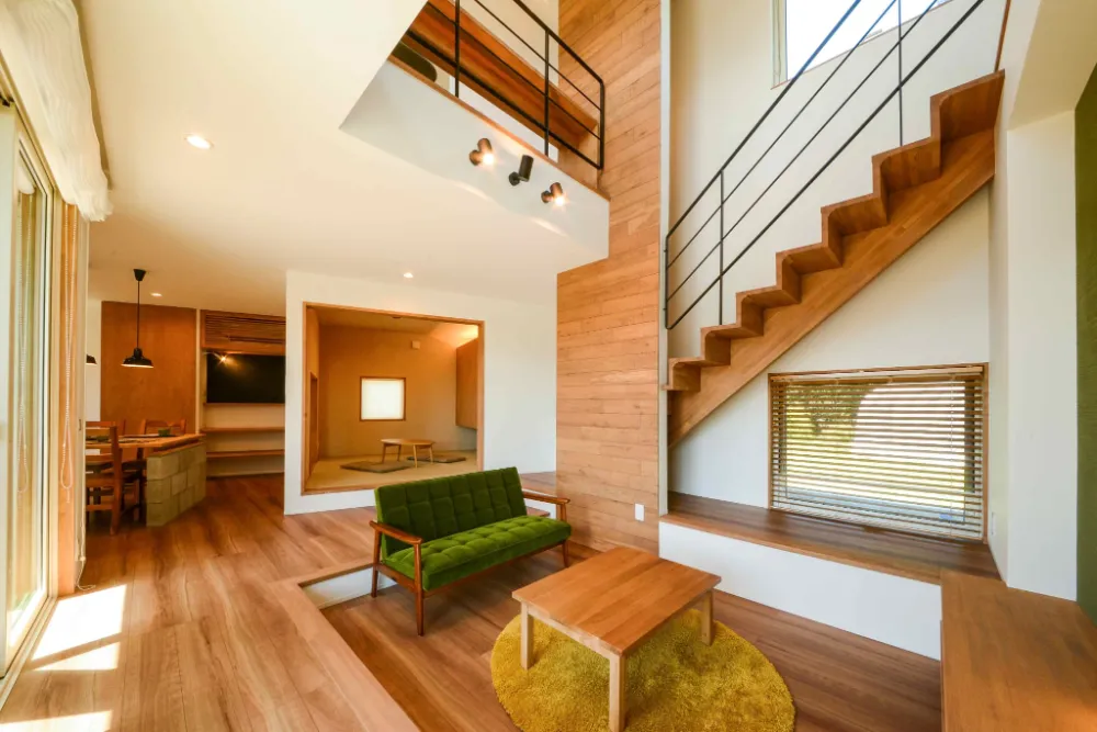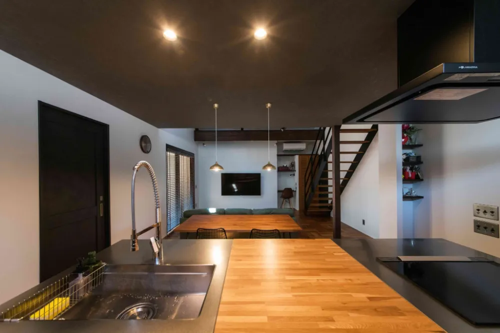 ナチュラルテイストのなかに照明や手すり、ダイニングテーブルの黒がアクセントに。リビング・キッチン・ダイニングと一続きの空間ながら、段差で視線をずらすことによって居心地の良い空間となってなっております。