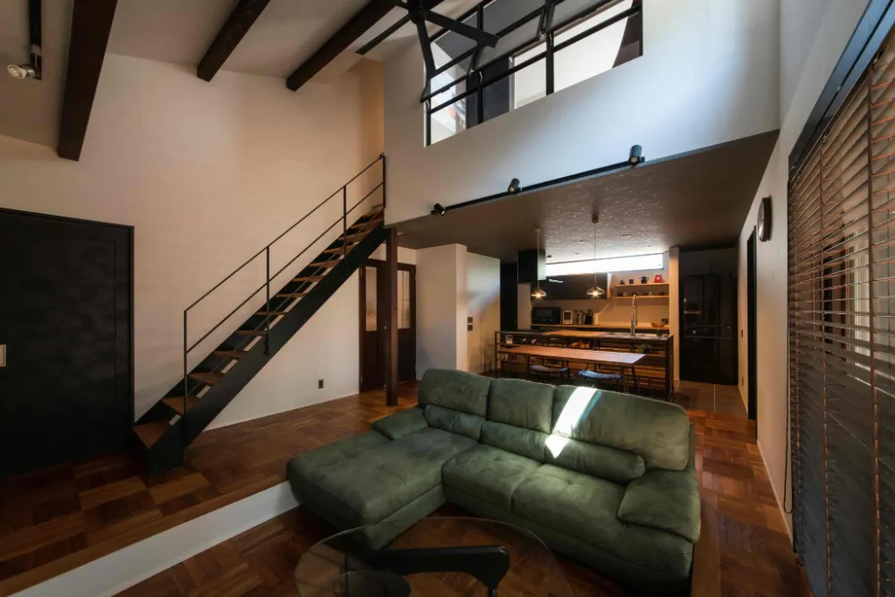 吹抜けにスケルトン階段、アイアン手すりがスタイリッシュさと開放感を生み出しております。天窓からの西日や夏の暑い日差しは、ブラインドでカット。突然の雨でもセンサーが感知し、自動で閉まるので安心です。
