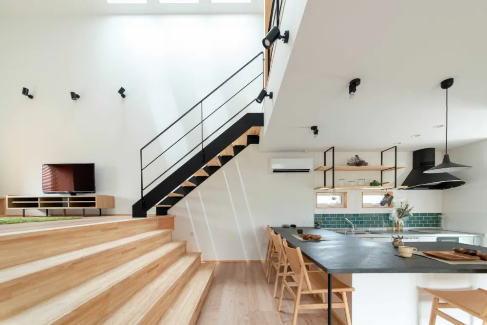 パーケットフローリングは四角形の床材かつさまざまな木材を使用しているため、床に敷き詰めることで色の濃淡を生み出し、趣ある空間に仕上げます。そして、特別感とくつろぎを演出するピットリビングを採用。吹抜けで開放感もあり居心地の良い空間となっております。
