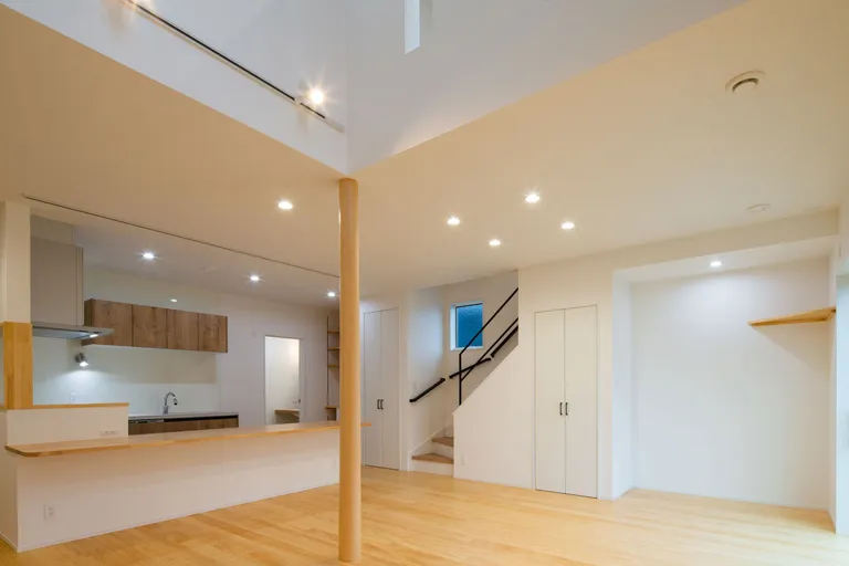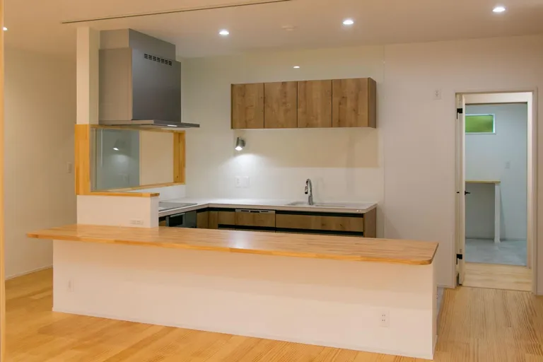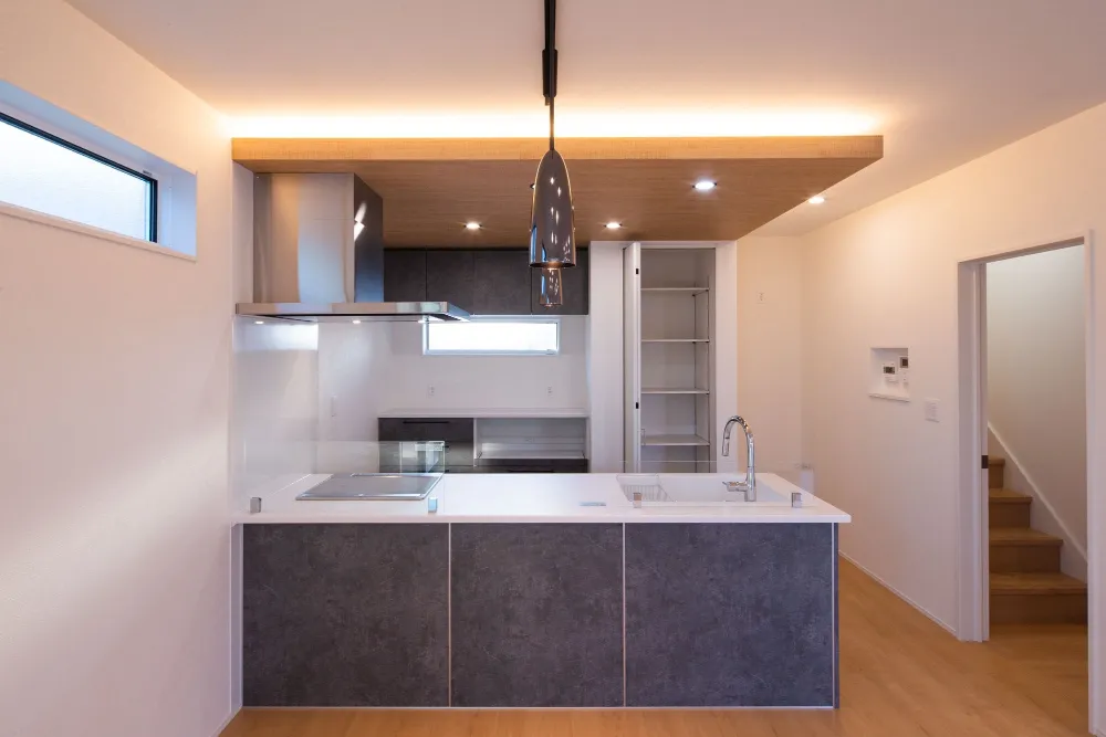 将来を見据えた「1階完結型」の暮らしを実現した松山市T様邸。一番のこだわりは、「キッチンを中心に生活のしやすい動線に」配慮した間取りです。キッチンからパントリー、水回り、そしてリビングへとスムーズに繋がる動線は、日々の家事負担を大幅に軽減します。さらに、キッチンに立ちながら和室まで見渡せる開放的な設計で、家族の気配をいつも身近に感じられる、高性能で心地よい住まいです。
