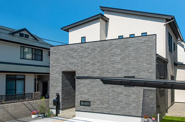 おしゃれで高級感のある自然石を使用した玄関まわりがシンプルな白い外観に映えます。