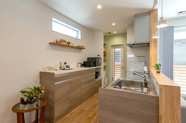キッチンの前にテーブルを置いていないので視界スッキリ、動線もスッキリなストレートダイニング。勉強するお子様から呼びかけがあれば、すぐに寄り添い様子も見守れるので安心です。