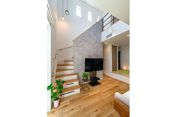 明るく開放感のある吹き抜け+リビング階段。ダイニングより一段低くしたリビングは天井を高く感じられ、包まれたような安心感のあるくつろぎ空間に。