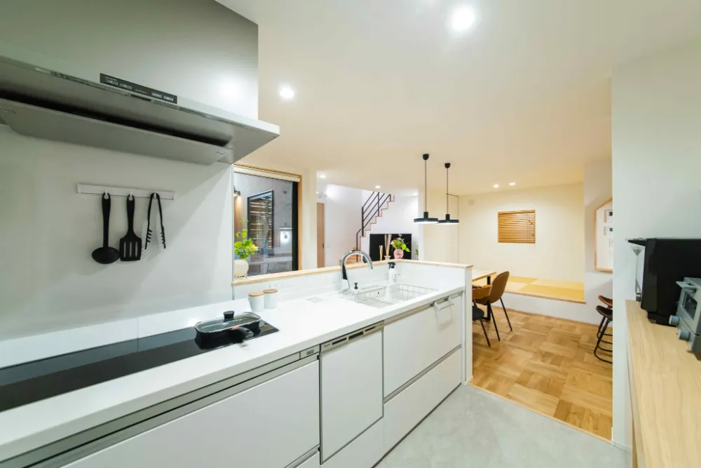 “日々の暮らしを紡ぐ住宅” LDK 家族のプライバシーを重視しながら、眺めのいい位置にLDKを配置しました。