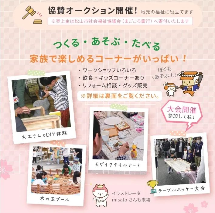 大工さんと一緒に楽しめるDIY体験や楽しいゲームコーナーに加え、軽食コーナーもご用意。