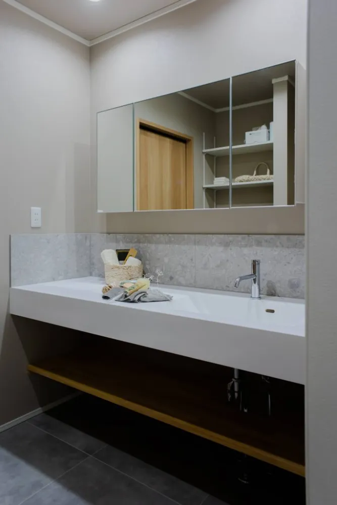 高級感のあるストーン調タイル カウンター正面に配されたグレーのタイルが、空間に上品な質感とモダンな落ち着きを与えています。