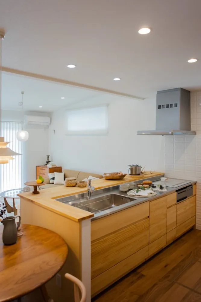 木の質感を活かしたデザイン キッチン前面のウッドパネルと厚みのあるカウンターが、家具のような温かみとおしゃれな雰囲気を演出しています。