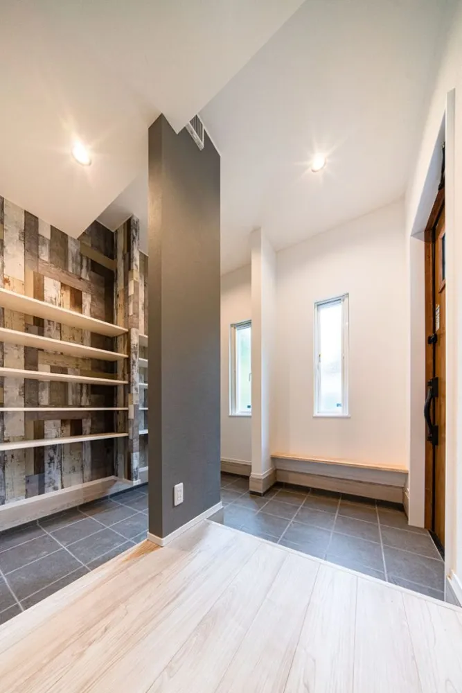 家族と来客を分けるダブル動線 中央の壁で空間を仕切ることで、生活感の出やすい収納エリアを隠しつつ、ゲストをスッキリとした空間で迎えられます。