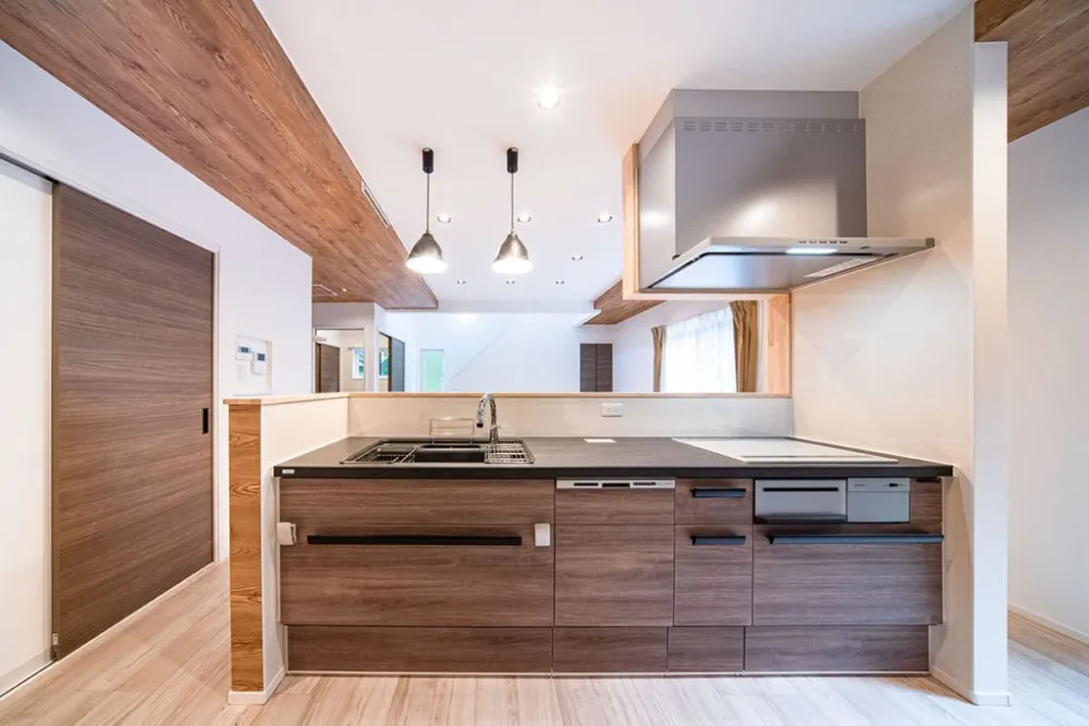 素材を連動させた天井デザイン キッチンの下り天井にも同系色の木目を用いることで、リビングとのエリア分けをしつつ、空間に一体感と奥行きを与えています。