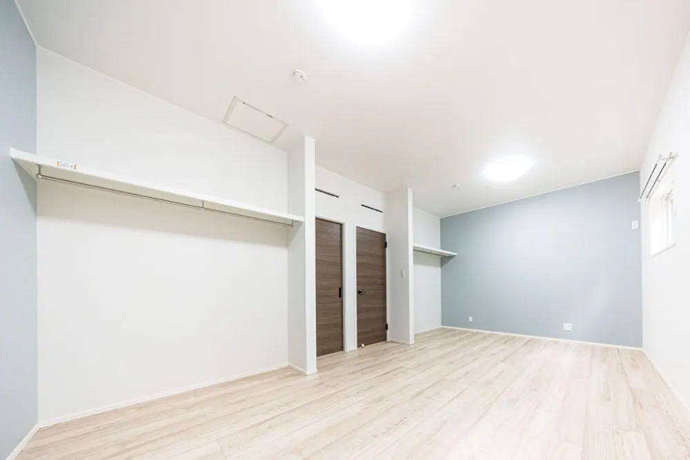 爽やかなブルーのアクセントクロス 淡いブルーの壁紙が、白を基調とした空間に清潔感と広がりを与え、リラックスできる雰囲気を演出しています。