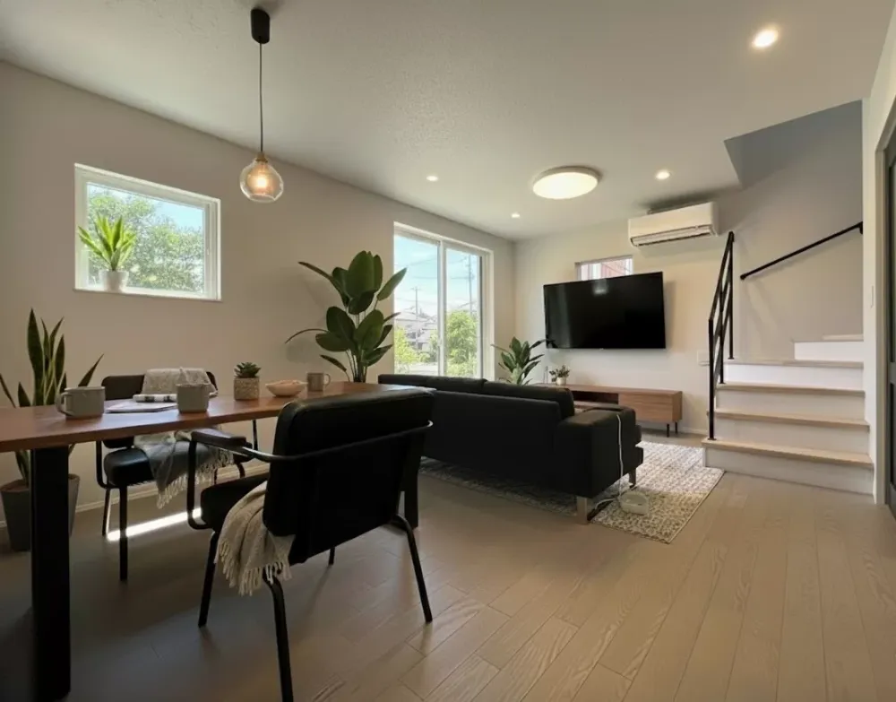 22畳のLDK。 広いだけでなく、右側にはワーキングスペース、左手にはご主人さんの友人が集うバーカウンター(折り畳み式を設けています)