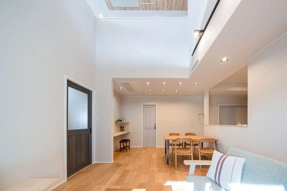 擦りガラスのFIX窓を玄関ホールに設けることで開放的な空間になっています。 朝は優しい光が差し込み元気に外出できる素敵な玄関。 土間を広く取り収納も十分。