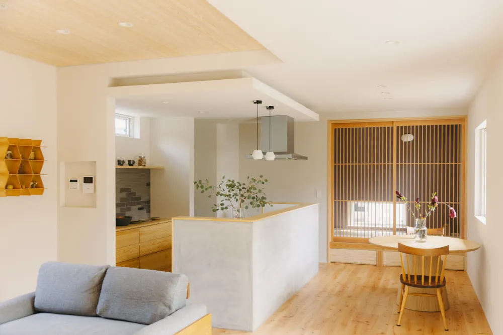 LDKの中心にあるのは、存在感のあるモルタルキッチン。シンプルでありながら、空間の印象を引き締めるデザインです。料理をする時間が、少し楽しみになる場所。